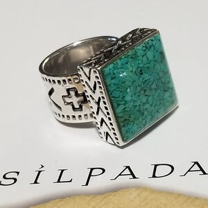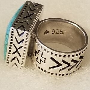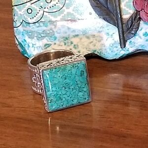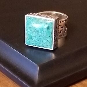 R1324 Square Turquoise set in an ornate square band. Size 5.5. Beautiful, unique, and hard to find piece in great condition!