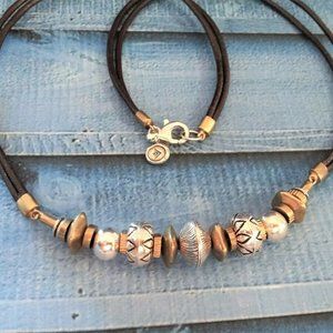 Very trendy and fun, with a row of etched Sterling Silver and Brass beads on Leather. Silpada Arrowhead logo stamped on hang tag.
