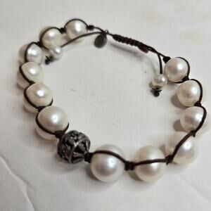 Silpada Vintage Sterling Silver & Genuine Large Pearls Brown Corded Bracelet