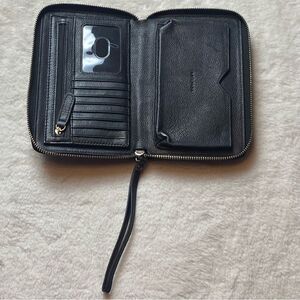 Silpada Zip Around Wristlet Black Leather With Cow Fur Accent. Great pre-owned condition. Removable ID and card slot snaps in place. Cellphone holder fits iPhone 11 Pro Max without a cover comfortably. Back zipper pocket and kiss lock coin holder. Slight scuffs on metal area. Measures approximately 7.5"x5", strap measures 6".