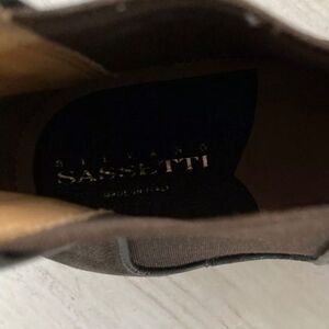Silvano Sassetti Brown Suede Ankle Boots in excellent condition. The boots dont have a marked size, but the insole measures approximately 11.25. Outsole is approximately 11.5. This would make the boots an approximate size 11. Excellent condition suede boots. Only flaw is writing on the bottom of the shoe. These boots sell new for $400-500. Dont miss this opportunity!