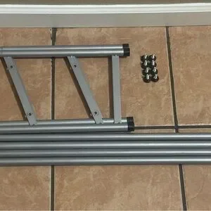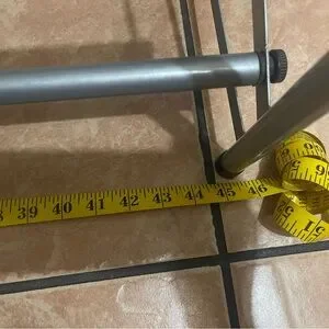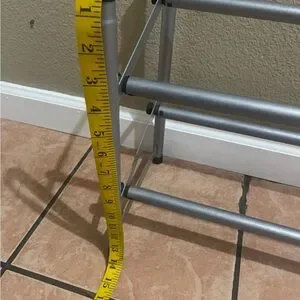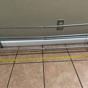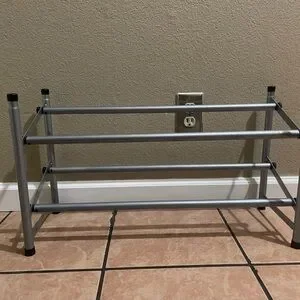 Metal shoe rack that is adjustable up to 45 inches, shortest length is 24 inches, and height is 14 inches. I will take it apart for shipping purposes, but it assembles back together in less than 2 minutes maximum. Only eight screws that you need to hand twist and it’s that easy (see last two pictures for reference of this).
