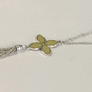 Silver 32" Necklace w/ 4-Petal Quatrefoil Yellow Enamel Flower Pendant & Tassel