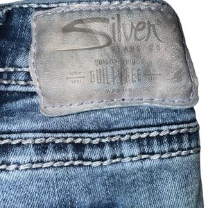 Silver Jeans Aiko Bootcut Jeans. These jeans are a "tried-and-true favorite" with a comfortable mid-rise and demi-straight fit that's contoured for natural curves. They are crafted in a stretch fluid denim that is ultra-soft and body-shaping. The style features a dark wash fabric with subtle hand sanding and whisker patterns. They have a bootcut leg and the signature S-scrolls on the back pockets.