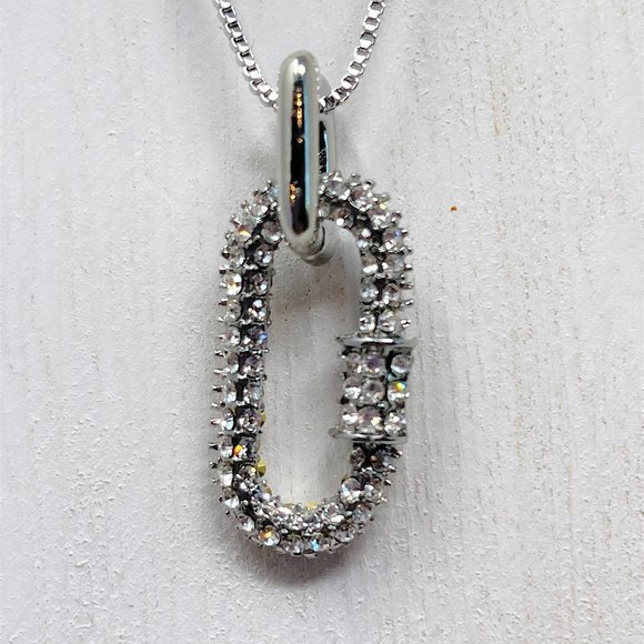 Silver carabiner clip pendant enhanced with Swarovski crystals on a silver adjustable chain. This is on a box chain that can be 17.5-20" and closes with a lobster claw clasp. Keep in mind that this is the size of the chain fully extended and will hang between 8.5" and 10" from the neck excluding the pendant. The pendant measures 1 1/4" long. This has a brass base and is coated with silver. This unique necklace has a beautiful sparkle!