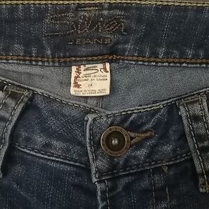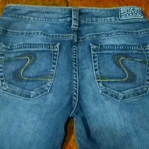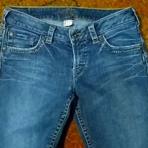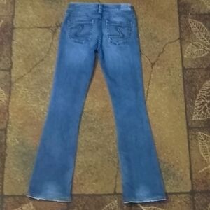 Silver Aiko Bootcut Jeans with Fading. Some wear on back hemlines, otherwise excellent condition. 75% Cotton, 25% Polyester.