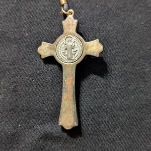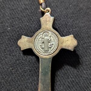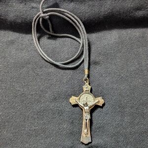 Silver And Brass Tone Saint Benedict Cross Crucifix Pendant Statement Necklace. 28" long. Could be tied shorter, if you want.