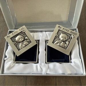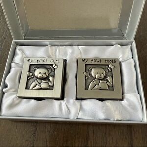 Adorable silver keepsake boxes for baby's first curl and tooth. Features cute teddy bear design.