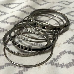 EUC Silver 8pc bangle set. These bracelets pair well for going out and that cute LBD in your closet! This bangle set has accents of black detailing in most of the bracelets too. This is not real silver and is costume jewelry. Comes as shown with the hearts bag (the bag is from Brighton, but the bracelets are not) Perfect stocking stuffer!