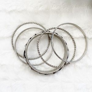 5 silver bangles. Refer to photos for bangle’s finer details.