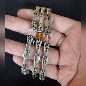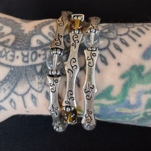 Silver tone bracelet, with beads and swirly embellishments. This set of 3 bracelets is stretchy and very comfortable. All questions welcome.