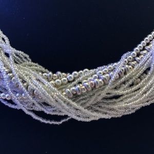 Beaded multi strand necklace with 29 strands of beads in 3 different sizes.
