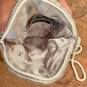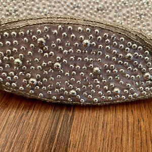 Darling silver beaded purse. Very useful. In great condition - hardly used. One missing bead (circled in blue in last picture). Approx. 6.5" across, 6" up and down, 2" at base. Strap is about 21" in length. Lining is in perfect condition.