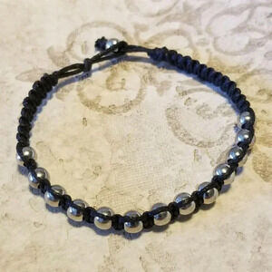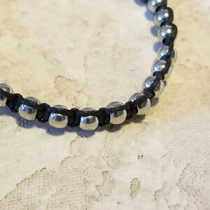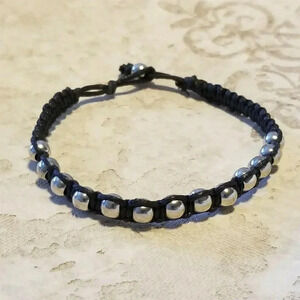 Black waxed cotton cord and silver acrylic beads bracelet is Shamballa macrame style. Beads are 6mm in diameter and bracelet is approximately 7 inches long with a button style clasp.