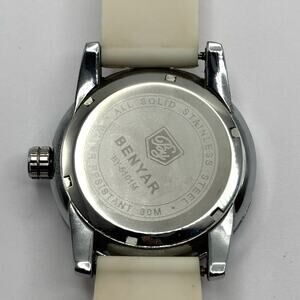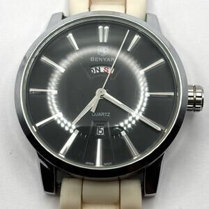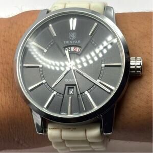Silver Benyar Men's Watch. Fully functional with brand new batteries. Adjustable band fits 8 in wrist or near. Day Window.
