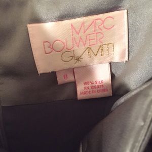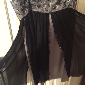 Funky and fun cocktail dress. The bottom is silver and it has four black, sheer overlay panels. Only worn once.