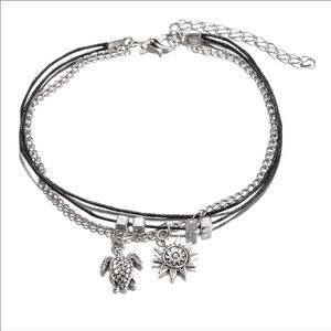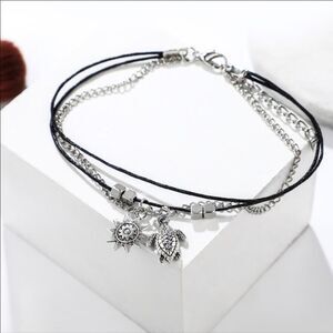 NEW silver charms and black rope Anklet! Multi layering with sea turtle and the sun in all it's glory boho-chic anklets for ankle leg attire for summer or year round!
