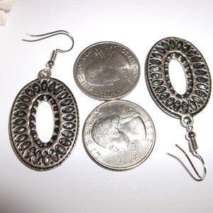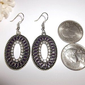 This pre-owned earring set is costume jewelry. They are antiqued dark silver toned with very sparkly faceted white faux diamond rhinestones. They have black enamel designs. The oval pair dangle and drop from French fishhook ear wires for her pierced ears. Measure 2 inches tall and 7/8 inch wide. Each single earring weighs 4.3 grams. This cute set could really glam up your look. Modern yet edgy! Buy it now before someone else does!