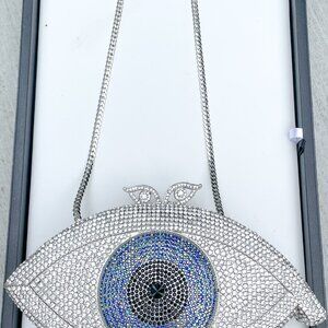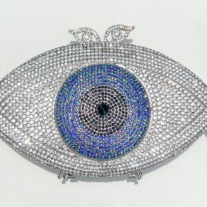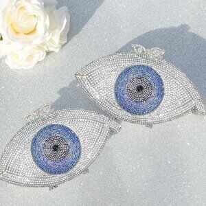 Silver, Black and Blue Crystal Rhinestones Evil Eye Luxury Evening Clutch Purse
