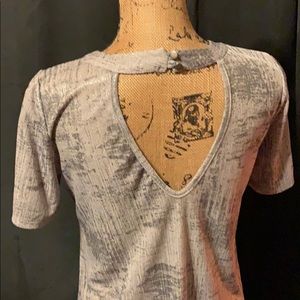 It is a two toned silver blouse that has a v cut-out in the front and back as shown in the photos above. The back also has two clasps to hold it. Size tag is cutout of it but it fits like a large.