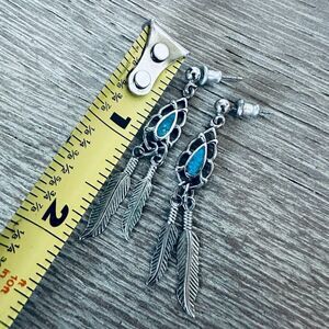 Beautiful silver and teardrop shaped sparkling turquoise blue stone boho feather drop earrings in excellent like new condition.