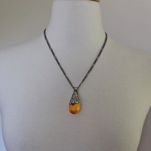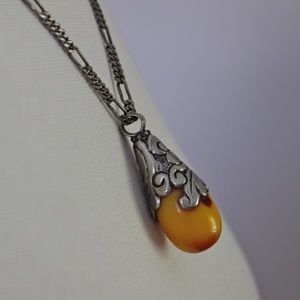 Groovy bohemian vintage necklace. Yellow stone is encased in a silver art nuevo style . Vintage clasp sets this necklace apart. 20 inches long