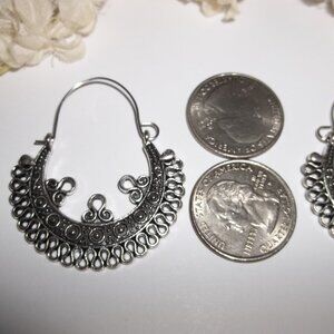 This pre-owned hooped earring set is just so cute. They are a dark silver toned costume jewelry. They have ear wires for her pierced ears. Measure 1 3/4 inches tall and 1 1/2 inches wide. Each single earring weighs 5.2 grams. Very boho! People are sure to give you lots of compliments when you wear them. Buy them now before someone else does!