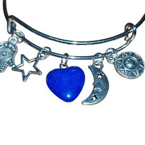 Silver Boho Natural Stone Heart Charm Adjustable Bangle Bracelet