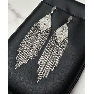 Boho Statement Silver Filigree Fringe Tassel Dangle Earrings Long Rhinestone Festival Jewelry
