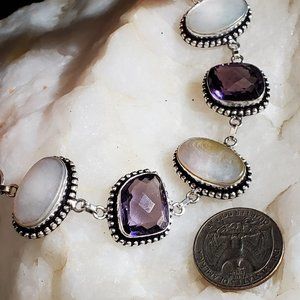 Silver Bracelet with Natural Mother of Pearl and Amethyst Quartz Stone, Great quality thick 925 silver-plated.' Adjustable chain, Bracelet Size 7