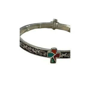 Very nice silver plated bracelet with Christian crosses inlaid with turquoise and coral. Clean shiny and has intricate design between the crosses. Stretchy with band lining the inside. 8.5 inches around.