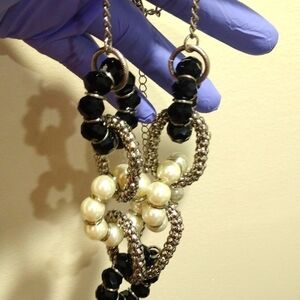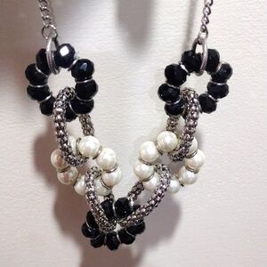 Elevate your style with this chic silver-tone necklace featuring distinctive hoops design adorned with black and off-white beads. The contrasting colors and unique hoop arrangement make this necklace a fashionable statement piece. The necklace is marked "NY," adding a touch of urban flair to the overall design. With a length of 20 inches and an additional 3-inch extension, it provides versatility in adjusting the fit according to your preference. NWOT
