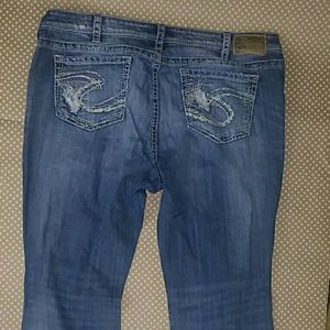 Boot cut jeans with distressed front lace backing on holes. Regular length. Please carefuly review photos as they are the best description. Worn twice.