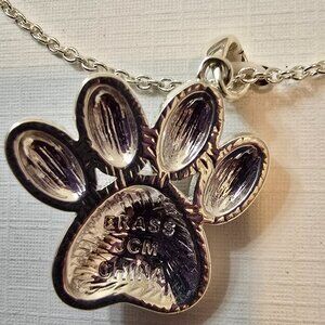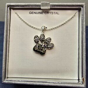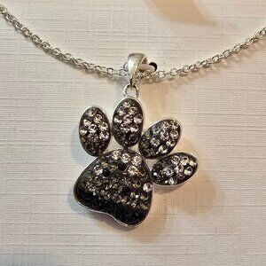 This is a Crystal Paw Print Silver Toned Chain necklace. It features a paw print pendant adorned with crystals, suspended from a silver-toned chain. This necklace is a popular choice for pet lovers
