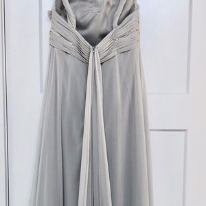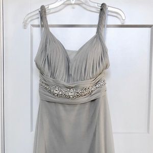 Silver, Bridesmaid/Mother of the Bride/Mother of Groom, Dress with belt. SZ 8, small piece of hem added to the front to cover cleavage. Worn once for my son's wedding. Low Back can not wear a bra with this dress. Belt can be removed it's just hand stitched on to the dress, was bought separately.