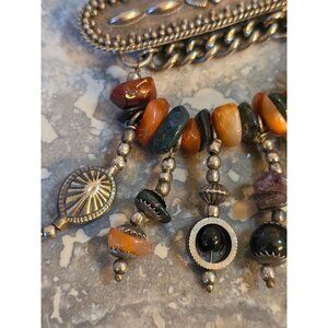 This brooch showcases a sophisticated design with multicolor beads and silver-toned accents. Its unique structure and captivating charms make it an elegant accessory for enhancing any outfit with a touch of vintage allure. The craftsmanship highlights attention to detail and artistic flair, offering a distinctive piece for collectors and fashion enthusiasts.