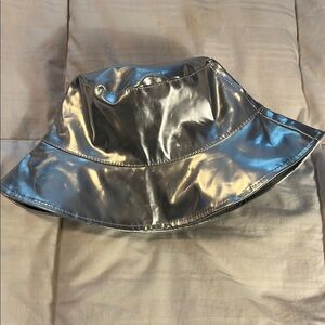 This silver bucket hat features a glossy finish that catches the light beautifully, adding a touch of elegance to any outfit. Its classic shape is complemented by a flexible brim, ensuring both style and comfort. Perfect for accessorizing any look with a hint of shine. Boutique overstock.