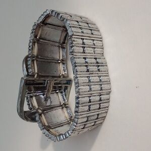 Stylish silver belt buckle stretch bracelet with a sleek design. Perfect for adding a touch of elegance to any outfit.