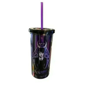 This 20oz plastic tumbler from Silver Buffalo LLC features a purple color and a design inspired by the famous name of the school from the hit TV show Wednesday, "Nevermore". The tumbler has a lid and comes with a straw, making it perfect for both indoor and outdoor use. The brand Silver Buffalo is known for producing high-quality glassware and drinkware, making this tumbler a great addition to any collection. The tumbler measures 7.5” tall and the purple straw is 10.5” tall.