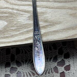 Elegant silver butter knife. Perfect for dining settings. a silver butter knife, "elegant" and "perfect for dining settings". It is plated silver, likely from the Wm A Rogers’ "Wildwood/Always" pattern made around 1958. Butter knives are typically used for spreading butter, cheese, or other soft spreads. They often feature a dull blade to prevent tearing of the bread or food being served. Silver butter knives, like the one pictured, is silver plate and may feature a decorative pattern.
