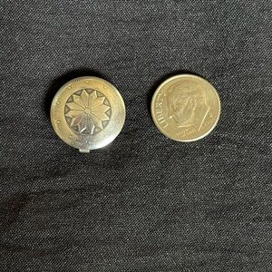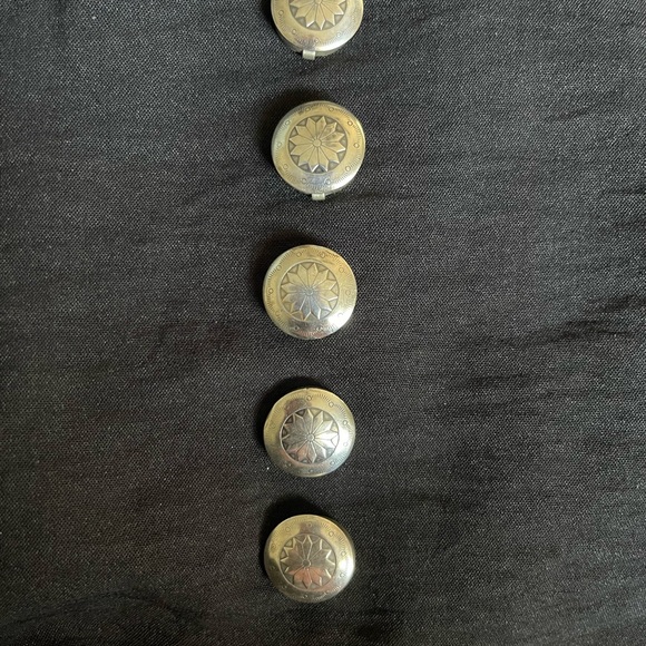 Five silver decorative button covers with southwestern design.