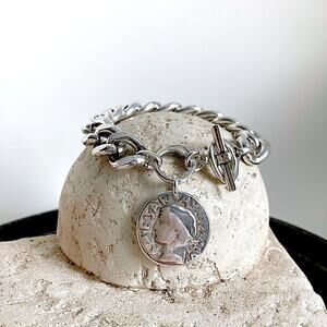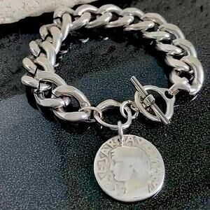 This stunning silver bracelet features a chunky chain link design adorned with a large circular charm Caesar coin pendant . The toggle clasp ensures a secure fit, making it a perfect accessory for any occasion. Different sizes available.