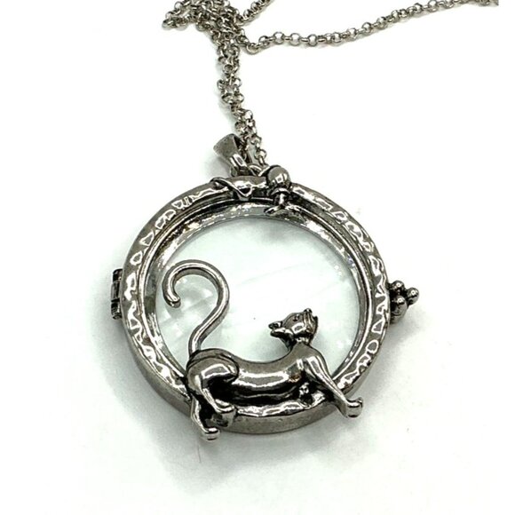 Silver Cat Design Magnifying Glass Pendant Necklace