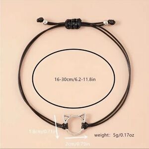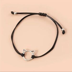 Charming silver alloy cat head bracelet on a black cord. Perfect for gifts.