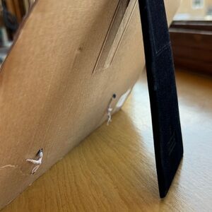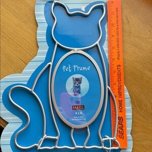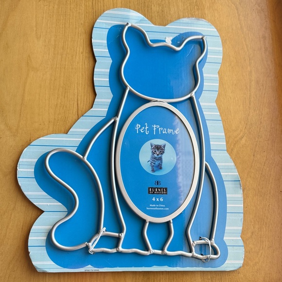 Simple vintage metal cat-shaped frame by Burnes of Boston. Features a sleek silver silhouette. Ideal for cat lovers.