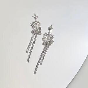 These stunning silver-tone earrings feature a unique celestial design. Each earring showcases a delicate heart charm with a planet accent and a star that dangles gracefully from a chain. Perfect for adding a touch of whimsy and elegance to any outfit. They are great for everyday wear or special occasions. These earrings are sure to catch the eye and spark conversation. Treat yourself or surprise a loved one with these celestial treasures!
