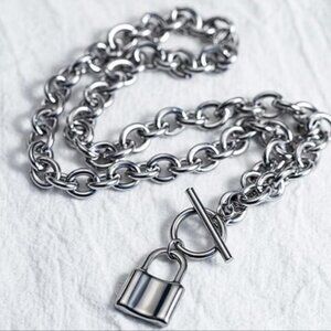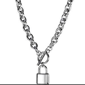 Silver chain necklace featuring a padlock pendant. Perfect for adding a bold touch to any outfit.