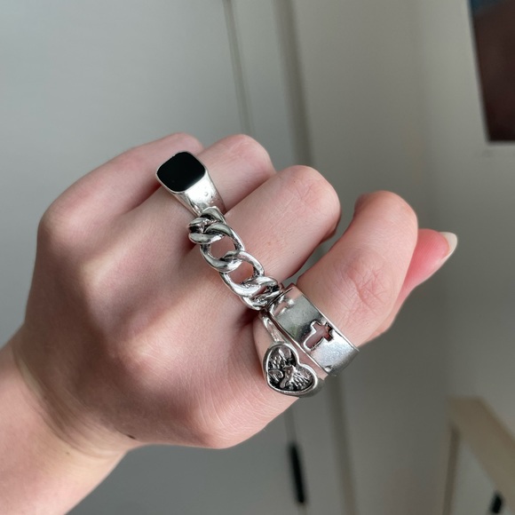silver toned ring set featuring chains and cherubs, gothic designs. fun addition to your wardrobe! never worn. alloy metal. ranging from size 5-8. 4 rings.