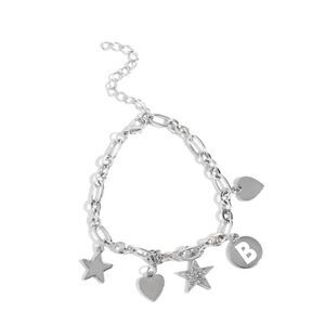 The silver chain is adorned with charms which includes a white painted "B" pendent. The bracelet's lobster claw closure is used to adjust the length from 7" to 9"