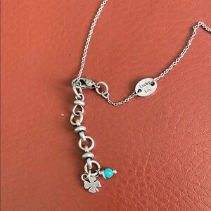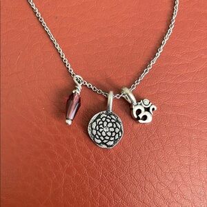 Sweet silver charm necklace with 3 small charms. Necklace is 15.5” long.